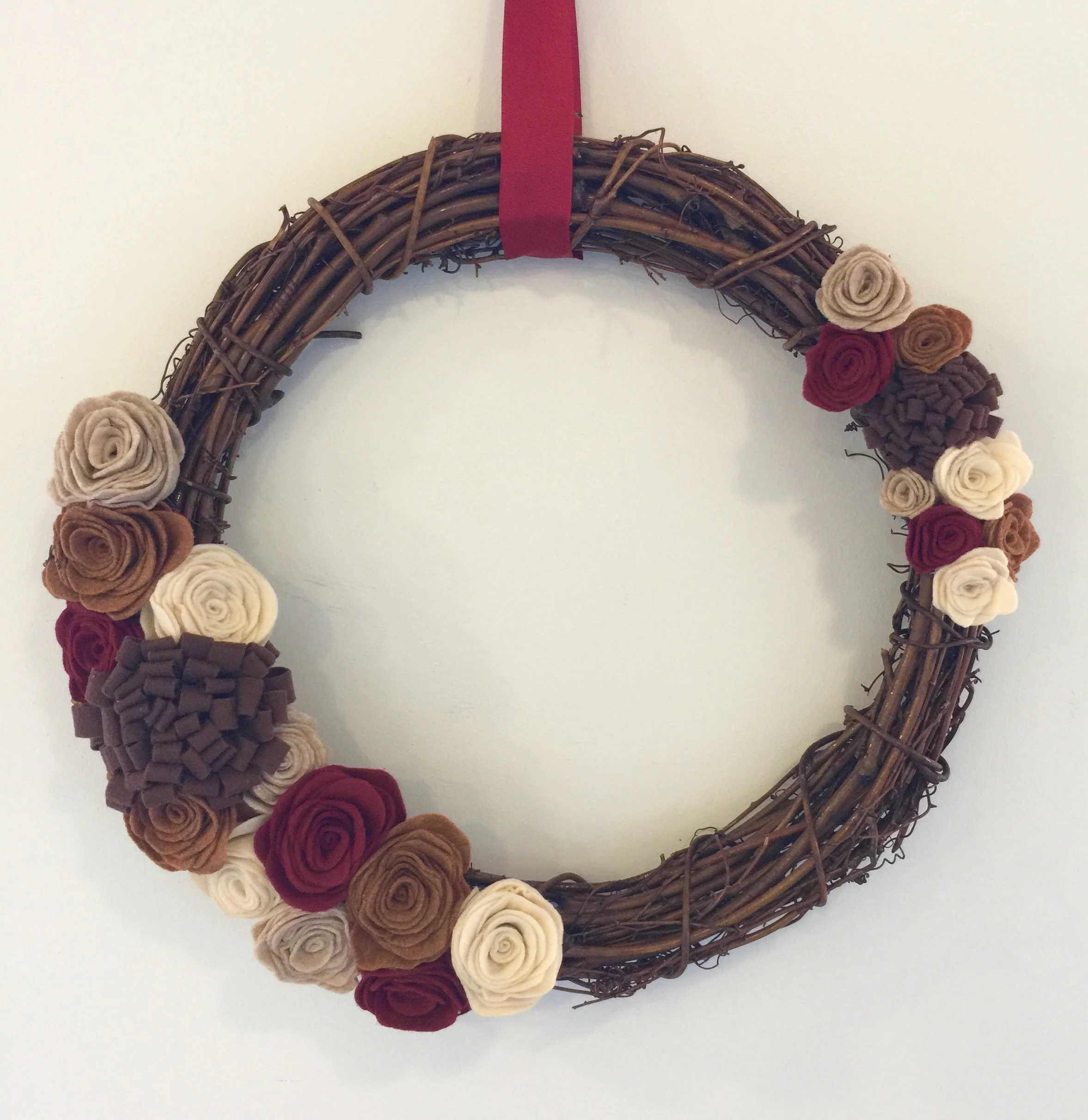 Get your front door ready for fall! Tonight we'll be making felt flower wreaths! First you'll learn how to make several different types of felt flowers. Then, in the colors of your choice, you will make enough felt flowers for your liking. Lastly, we'll use floral wire and glue to attach the flowers to a grapevine wreath. We will hang our wreaths with a piece of burlap or colored ribbon. You can choose from two sizes of grapevine wreaths. The 18" wreath is $34 and the 13" wreath is $28. All supplies are included in the class fee. No refunds are given for cancellations with less than 72 hours notice prior to workshop start.
