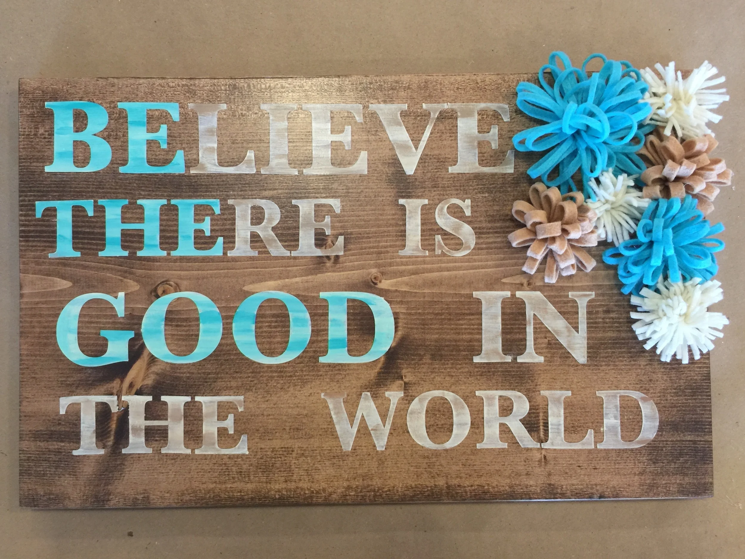 Today we'll be making quote boards! To make these cute pieces of home decor we will adhere pre-cut vinyl onto a pre-stained wooden plank. You also have the option to paint the boards. You will choose your quote ahead of time (with the form to the left) so that it can be pre-cut and ready for you when you arrive! There is a list of quotes in the drop down menu on the left or if you have a favorite quote in mind you can type it into the box.