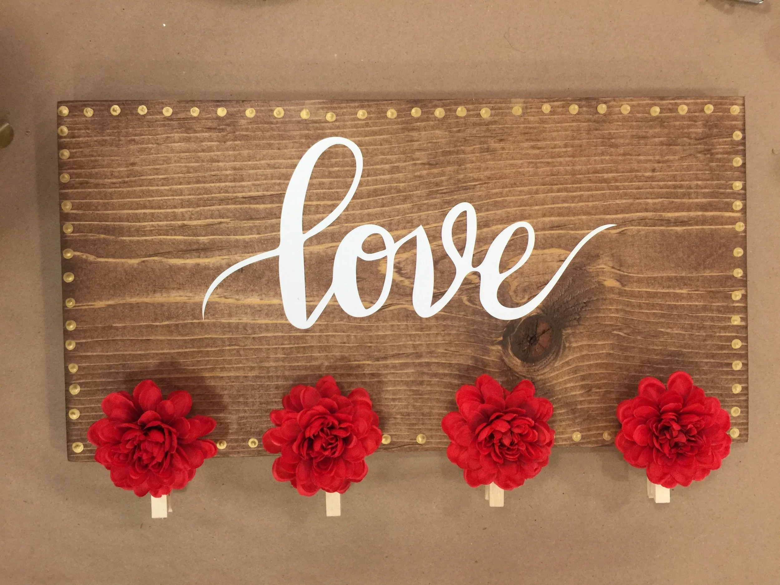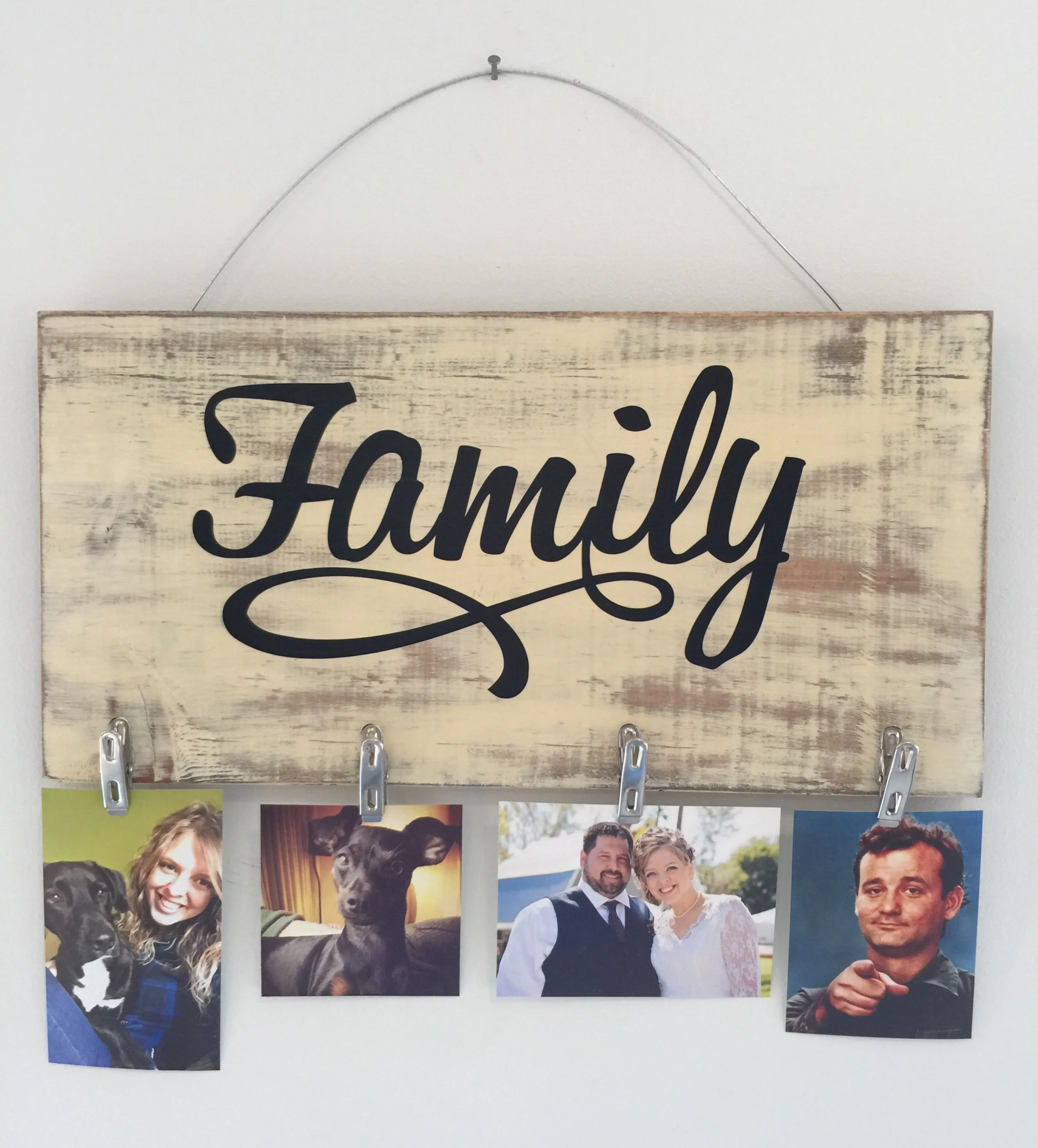 Showcase your loved ones with this adorable wall hanger. You will have the option to leave the sign it's pre-stained color or we will show you how to add a vintage look to it using paint and sandpaper. Then you will learn how to easily apply the vinyl text using vinyl transfer tape. Finally we will adhere metal photo clips and a wire hanger. You can choose from the following sayings: