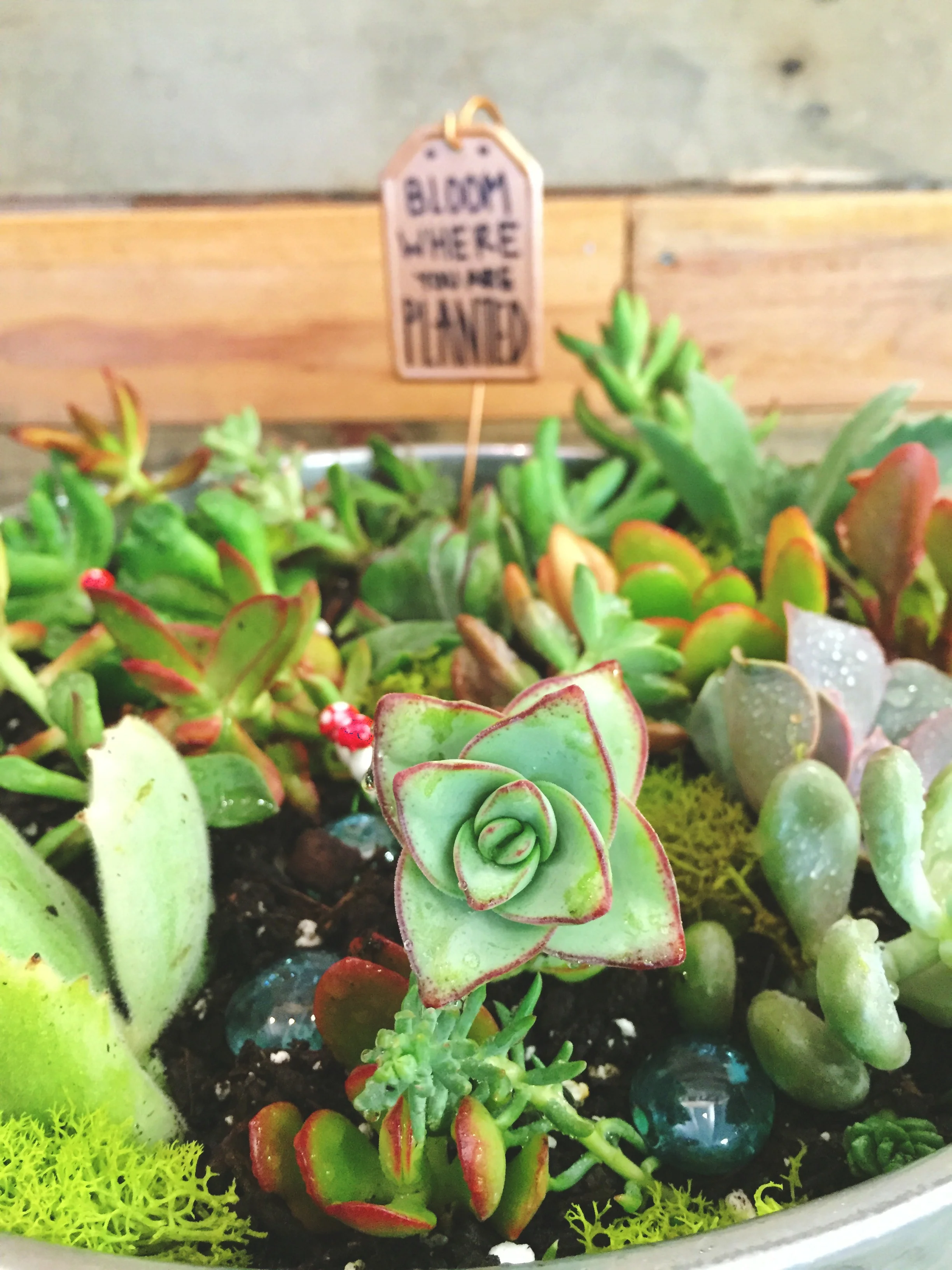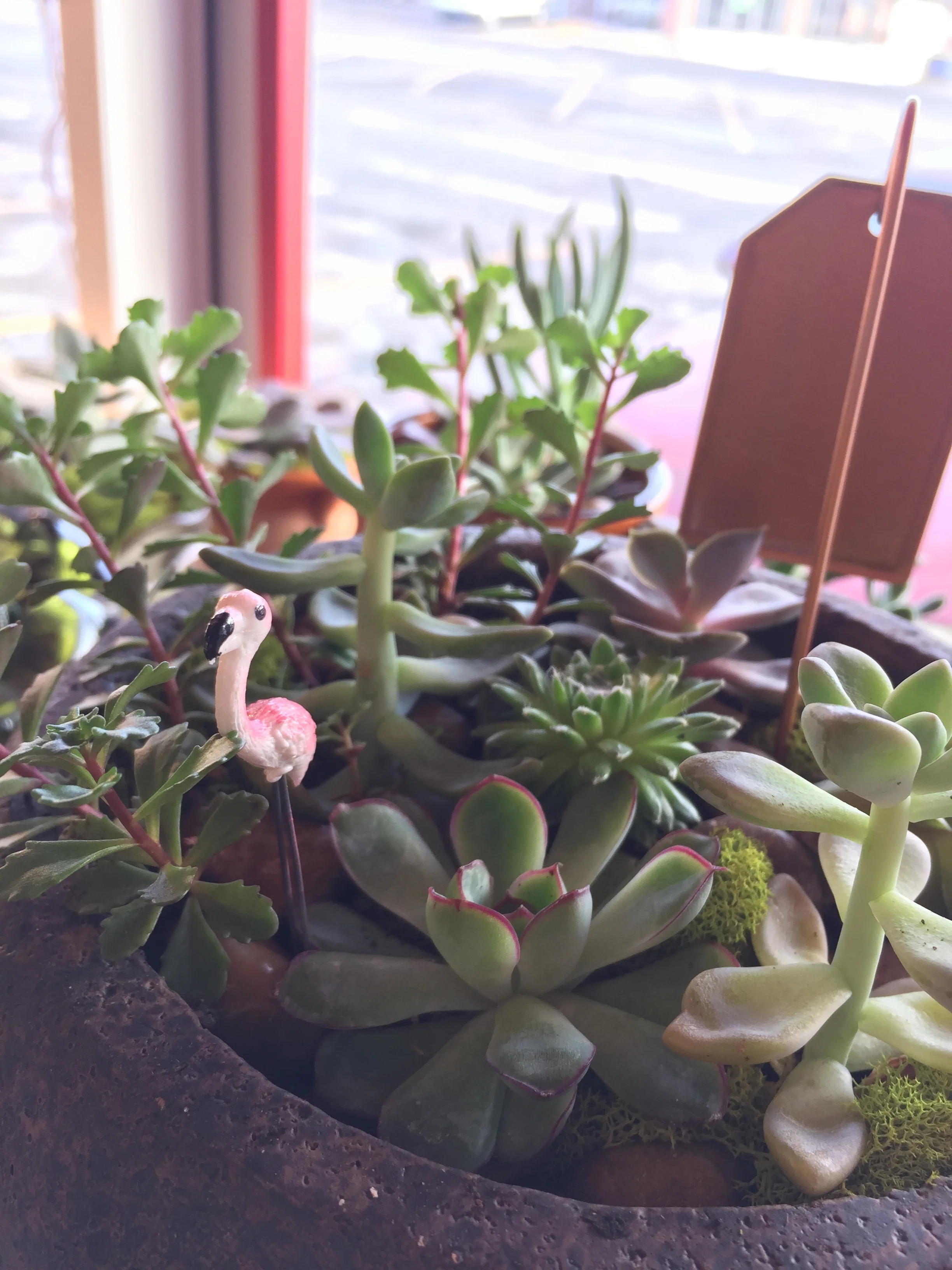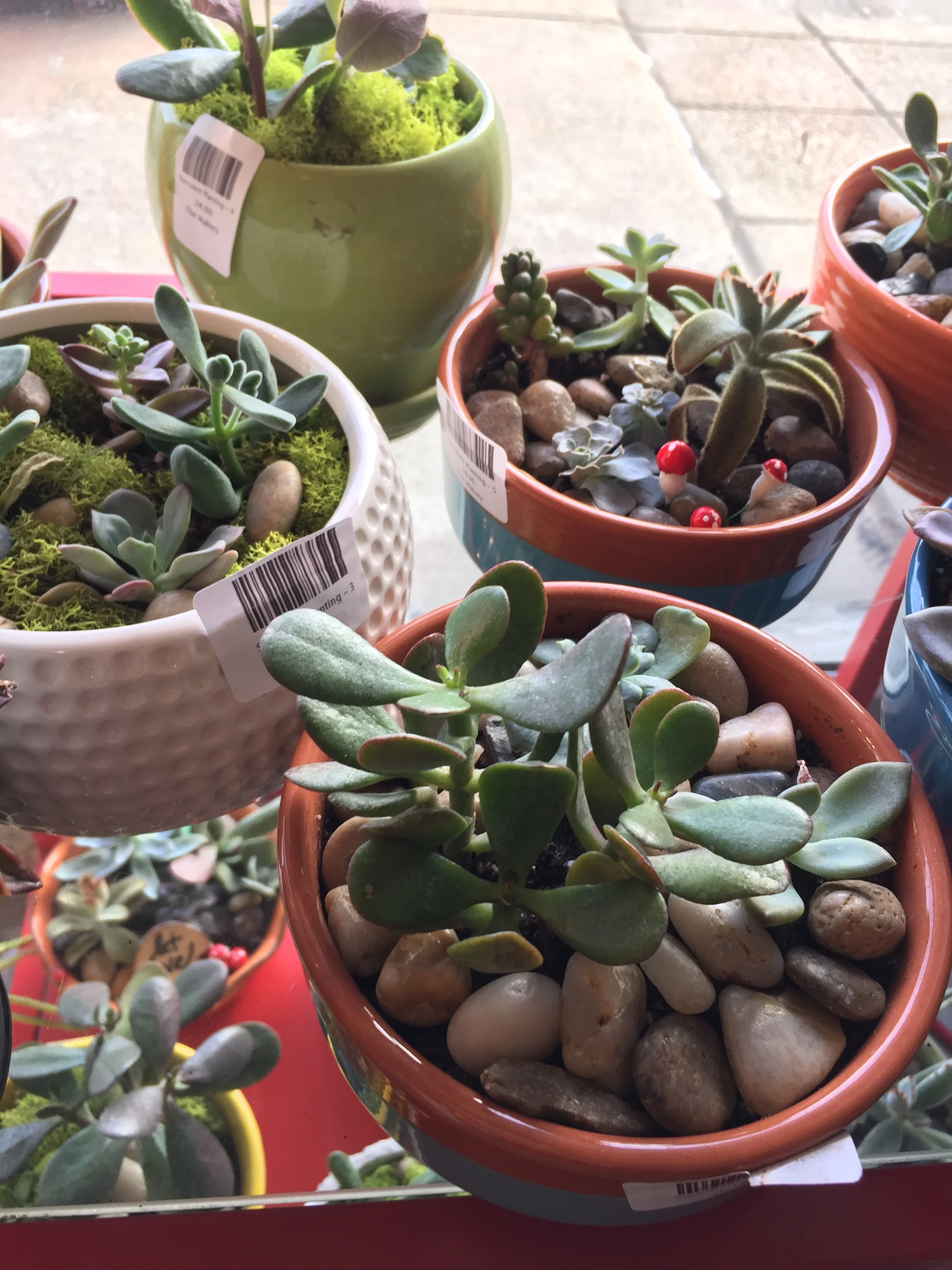 You are going to create your own personalized, potted succulent. Our succulent bar will be fully stocked with a large variety of containers/pots, succulents, colored rocks, fairy garden decor, decorative elements and garden signs for you to personalize, and of course, soil!